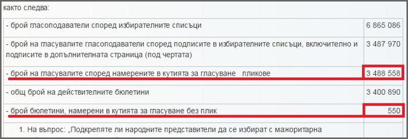 В изявлението си ЦИК при оповестяването на крайните резултати от вота пред медиите също уведомиха, че за да бъде задължителен референдумът не достигат 12027 гласа! Според тях дори и да прибавят намерените 550 бюлетини без плик, вота остава НЕ задължителен!